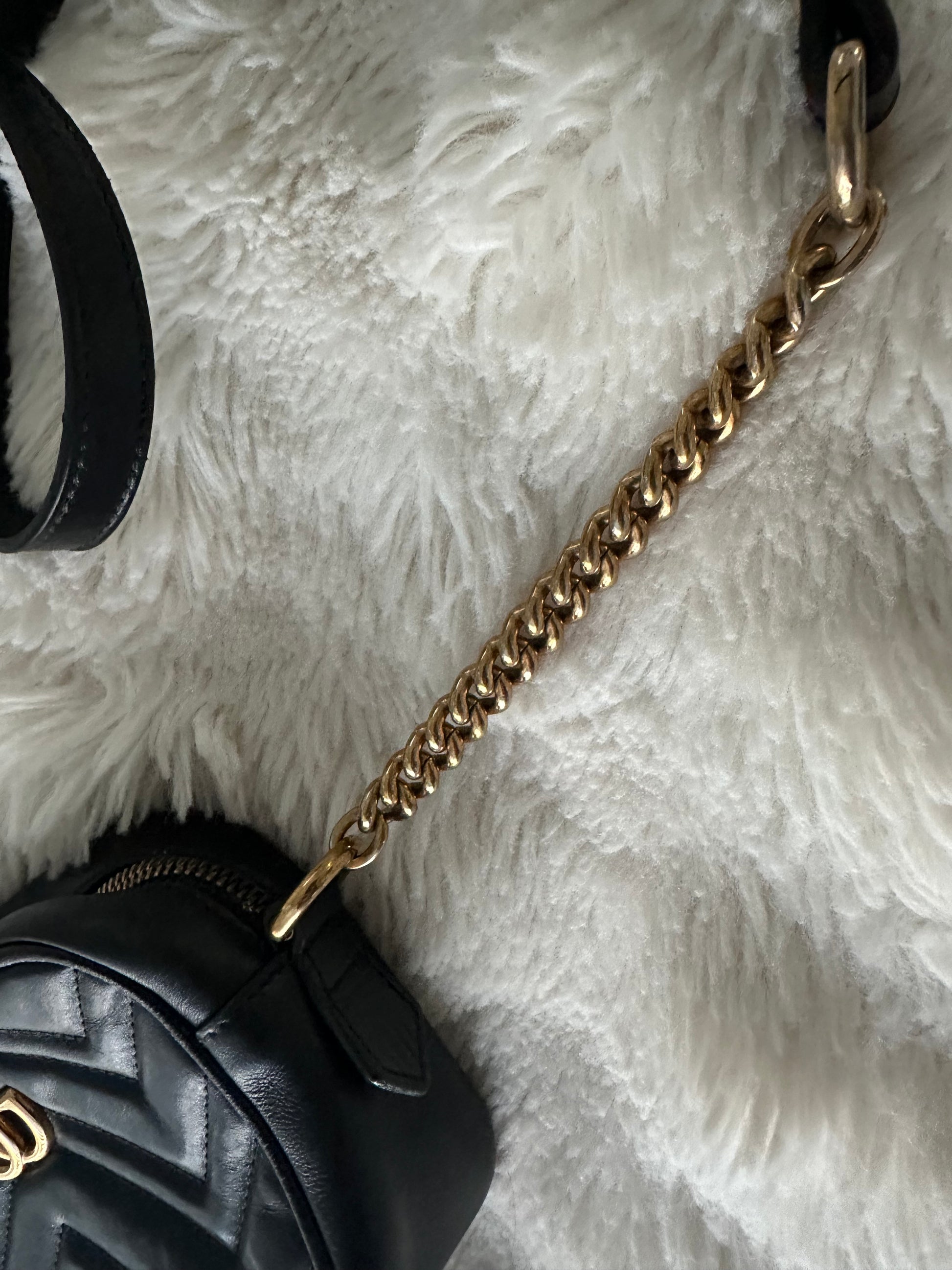 Features: Black matelasse chevron leather exterior; stitched GG on rear; antiqued gold tone hardware; chain and leather shoulder strap; top zip closure to main compartment; beige microfibre lined interior with 1 x slip pocket.