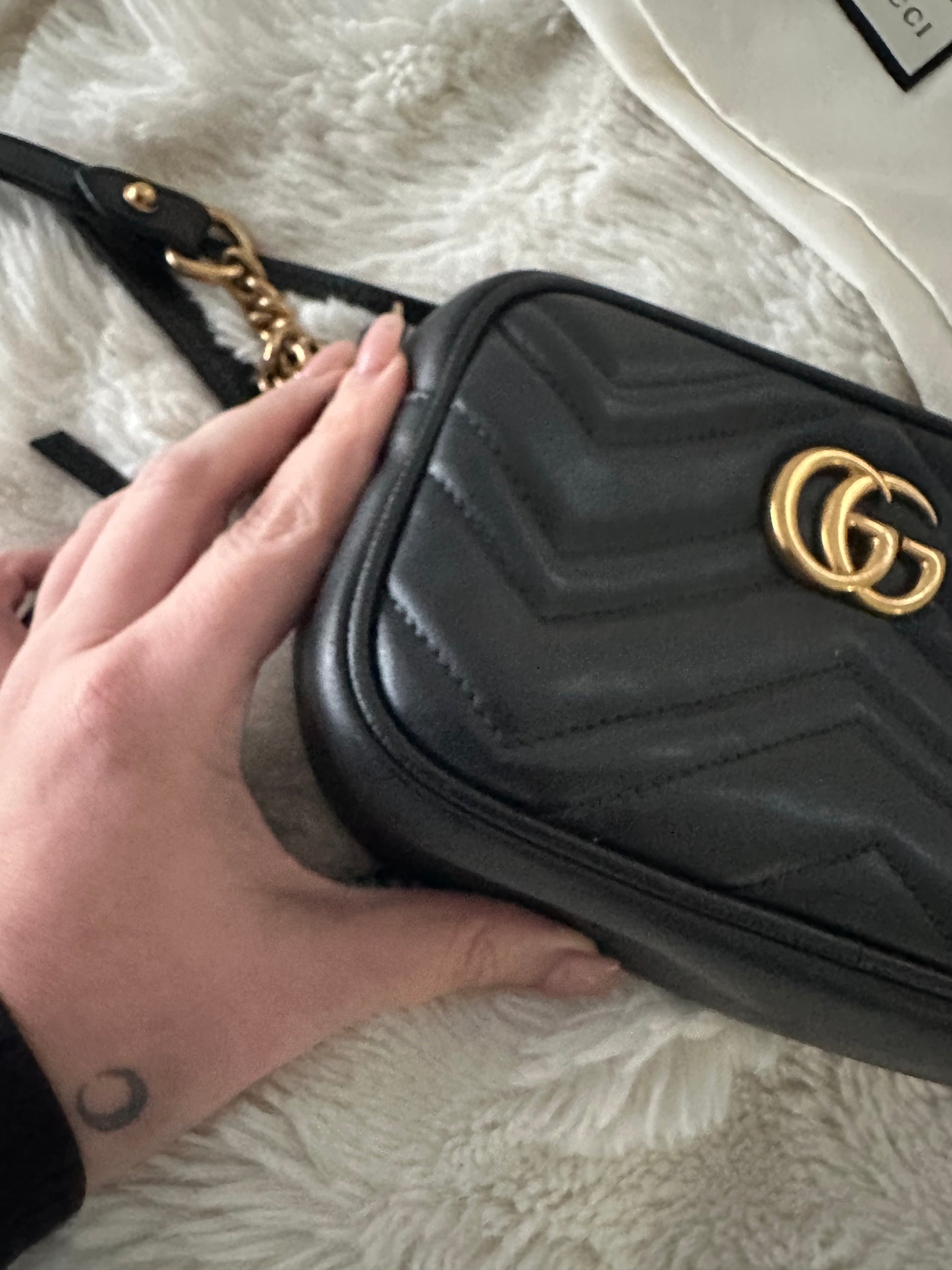 The mini GG Marmont Camera bag, crafted in matelasse leather with a chevron design and stitched GG on the back, combines a softly structured shape with double G hardware, offering both beauty and practicality.