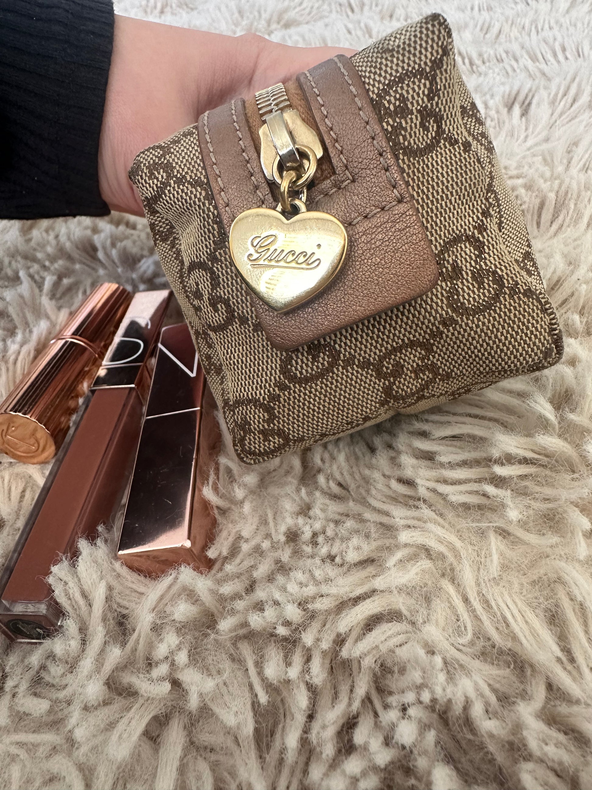 Gucci Cosmetic Pouch - Rose gold GG Canvas gold tone heart zipper pull.