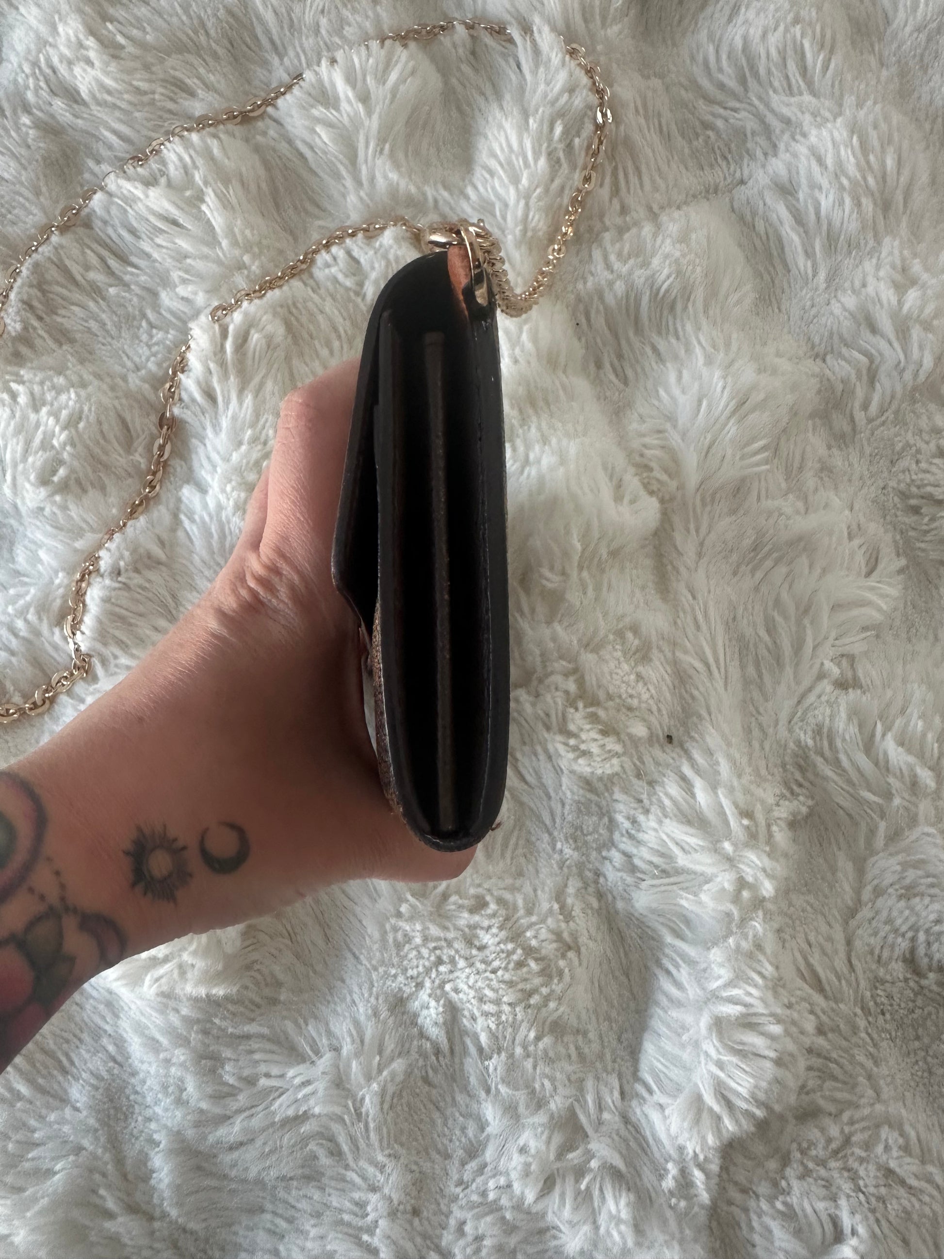 comes with an added gold tone cross body chain which is removable and fits an I phone in slim fit case. 120 cm drop