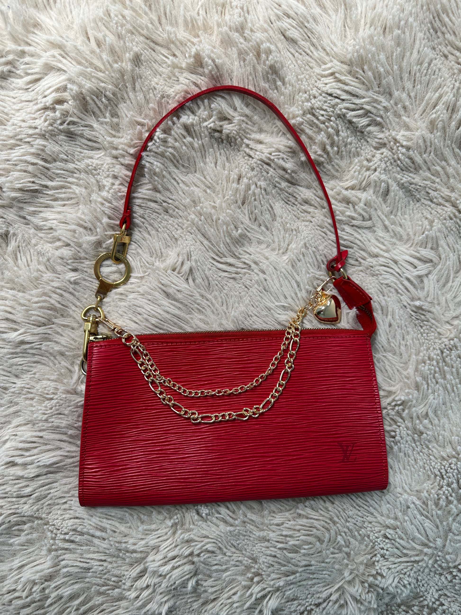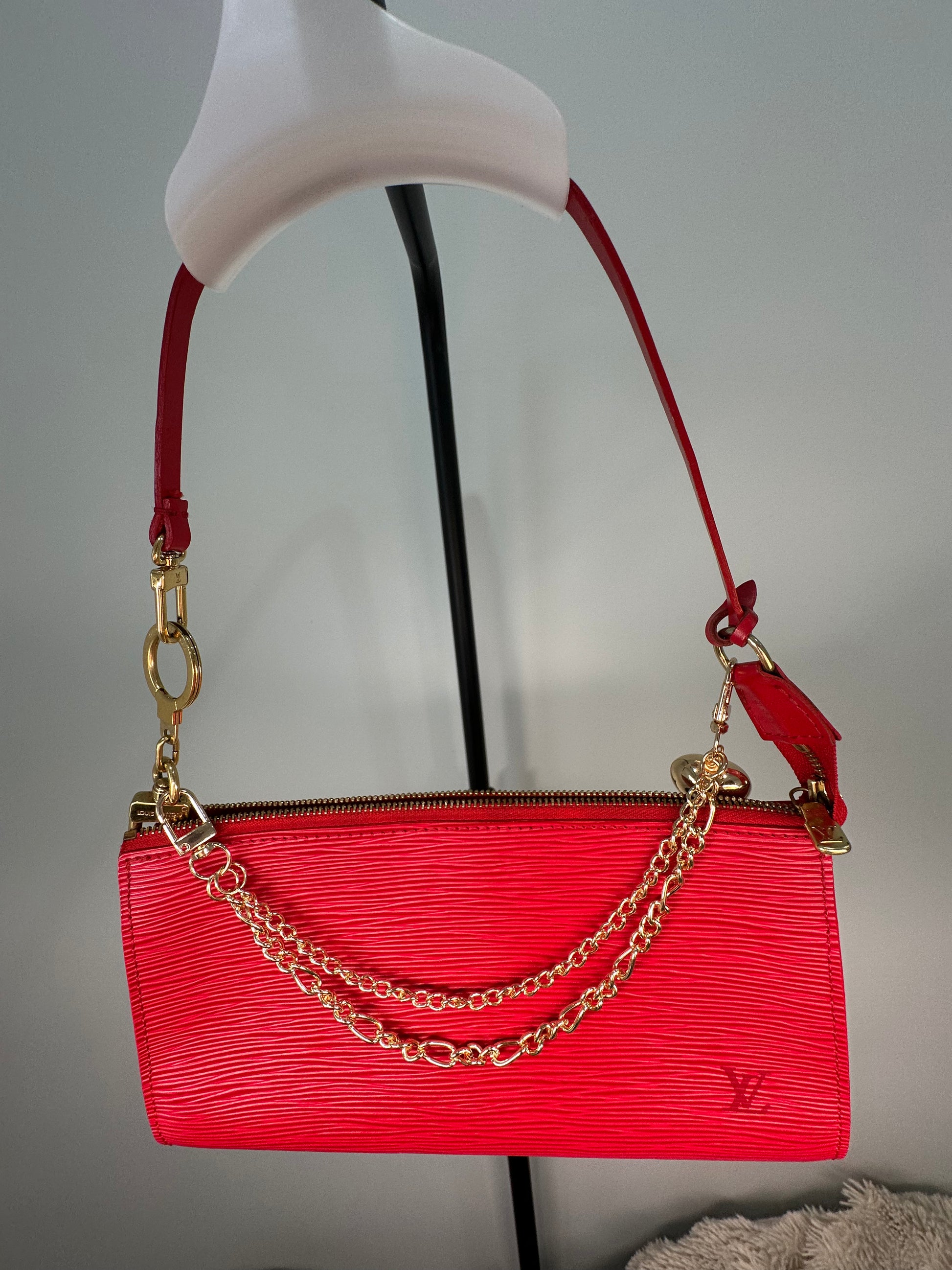 This authentic Louis Vuitton Epi Leather Pochette showcases the brand's legendary craftsmanship in vibrant red. The distinctive textured Epi leather resists scratches while maintaining its luxurious appearance. Compact yet practical, this versatile pochette securely holds your essentials with signature LV elegance—perfect for special occasions or as a sophisticated everyday companion.