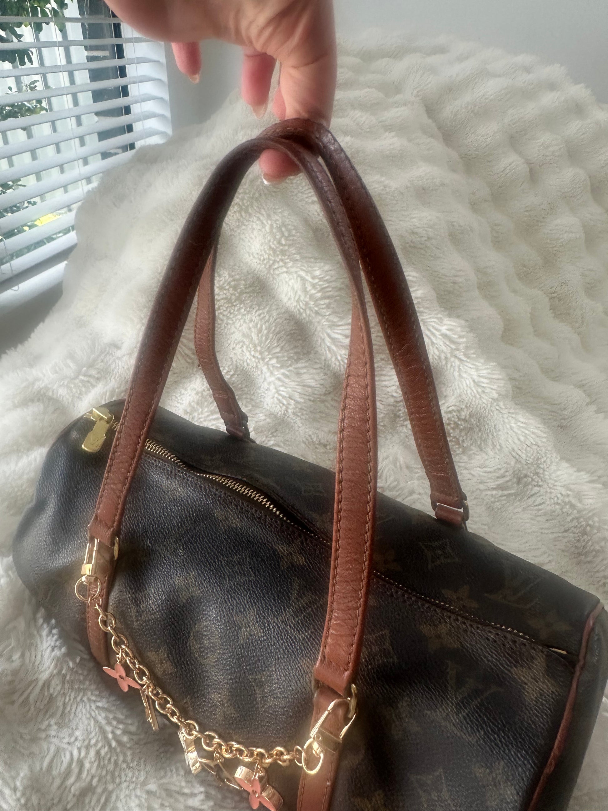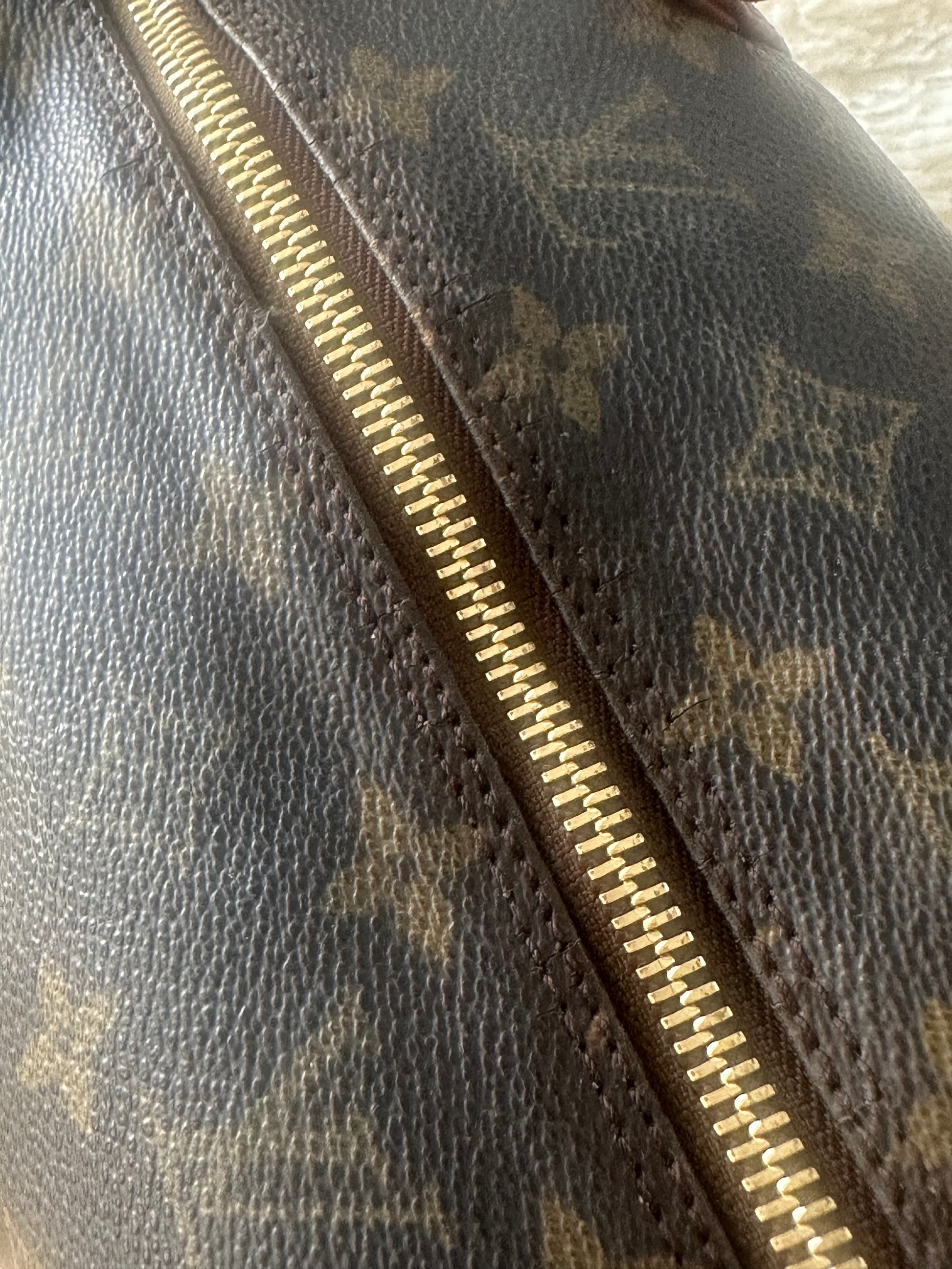 Note there IS wear to this vintage bag, it is not new condition, wear is including but not limited to. to worn vachetta leather on edges and handles. Small hairline cracks along the zip. Patina to leather handles and edging. Not for picky buyers. Check pictures and videos carefully before buying all sales are final.